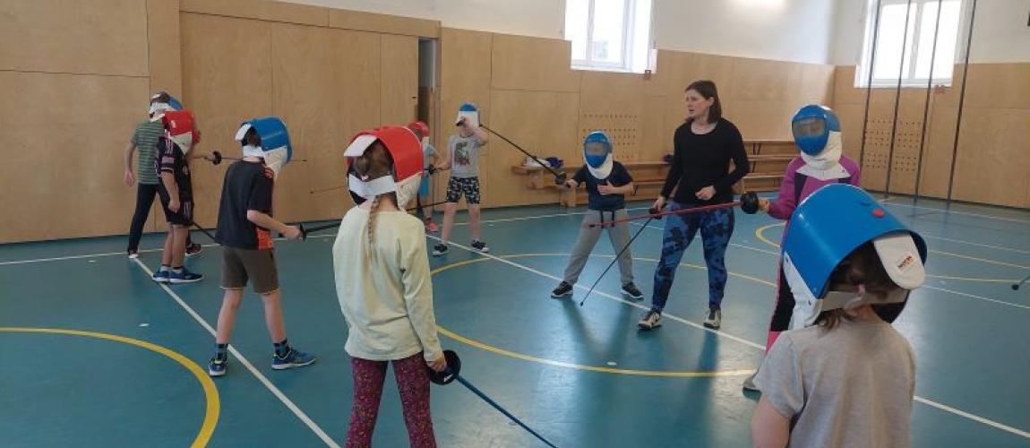 V rámci pohybové výchovy se děti z 1.A a 2.B po tři týdny seznamovaly s jedním z méně známých sportů. S paní trenérkou měly možnost nahlédnout do činností a aktivit sportovního šermu. Děti přijímaly nové zkušenosti s nadšením a všechna setkání si užívaly. Nyní se už velmi těší na další v řadě sportů, které si letos vyzkouší, na karate.